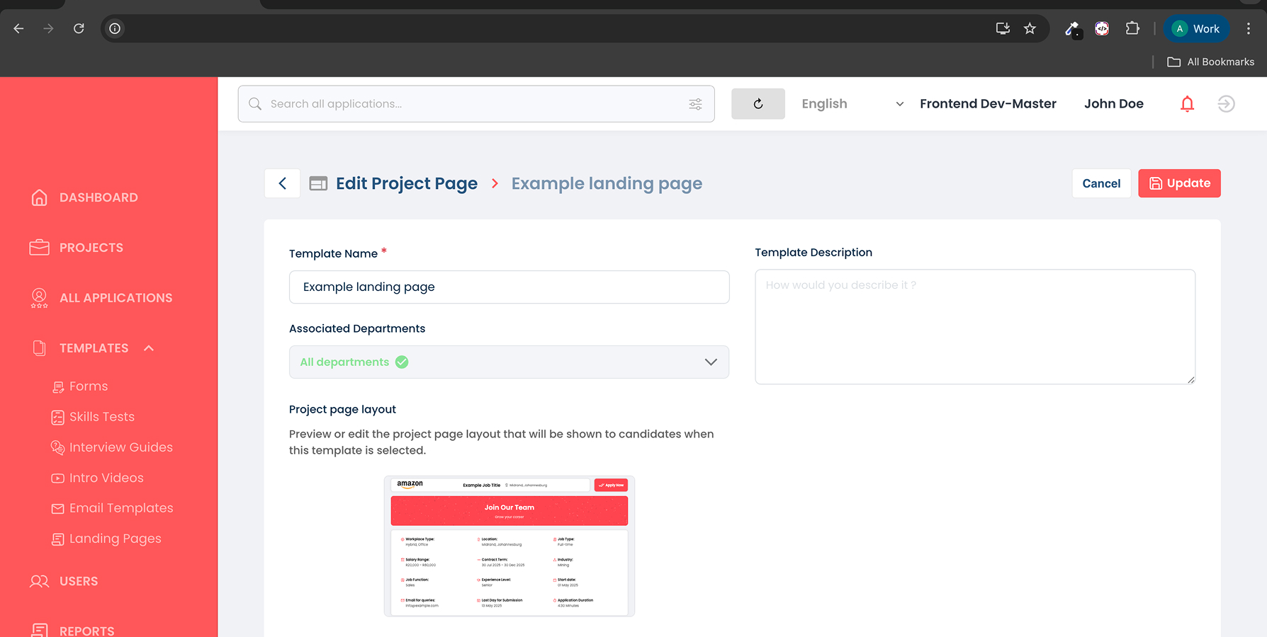 We developed a landing page builder based on GrapesJS allowing HR specialists to create custom landing pages for each job opening without developer involvement. These landing pages replaced the old login page and became part of the candidate journey. We integrated React components with complex logic into the candidate module to support flexible visualization and interaction. Existing invitation links were redirected to the new landing pages with full backward compatibility
