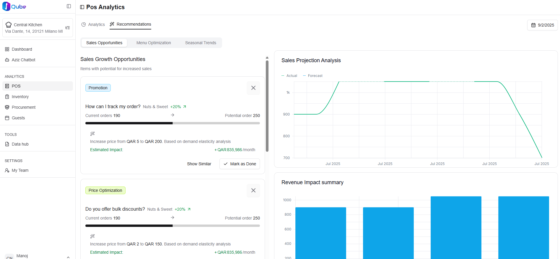 As a solution, we built a unified platform that consolidates all restaurant data into a single core, powered by four components: the Insight Hub for centralized analytics across sales, procurement, inventory, and customers; Decision Intelligence with ML models for forecasting, optimization, pricing, and anomaly detection; the Aziz Virtual Assistant, a conversational chatbot enabling natural-language interaction; and Restaurant Workspaces, tailored dashboards for cafés, QSRs, cloud kitchens, central kitchens, and fine dining